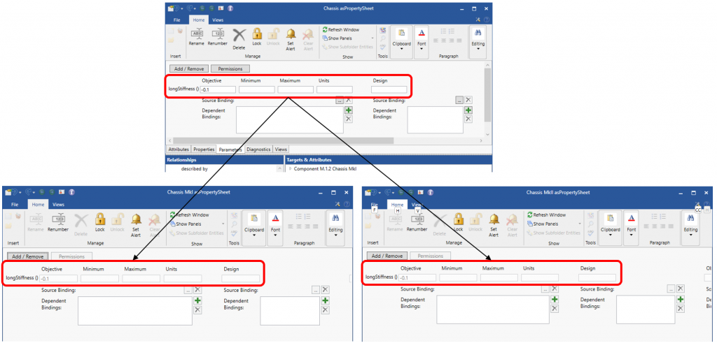 The relationship generalization of also provides the concept of inheritance. With inheritance, the same parameter used in the baselined component design is also inherited by the components involved in the trade study. In this example, the MkI chassis and MkII chassis inherit the “longitudinal stiffness” from the baselined chassis. (I created this parameter for the chassis design to be able to evaluate the components in the trade study quantitatively. I am neither a mechanical engineer nor a motorcycle designer. “Longitudinal stiffness” is merely fictitious characteristic invoked to demonstrate the relevant concept.)
