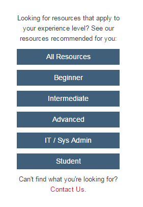 In addition, on the right-hand side of the page you can navigate to customized menus that will bring you resources specific to your experience level: