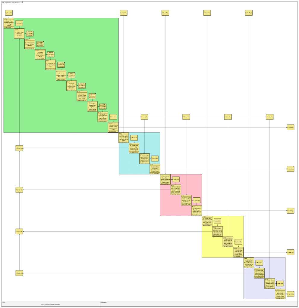 I have highlighted the functions on the diagonal in white boxes indicating where functionality is the same or the same and just distributed across controllers. I have also highlighted in grey where the functions are the same but have been slightly modified. And finally, I highlighted the exchanges that are new in light blue. What the analysis exposes is that there are 20 new functions, 10 modified functions, and 32 new exchanges. This is illustrated in the expanded view of the upper left corner box from the larger N2 diagram.