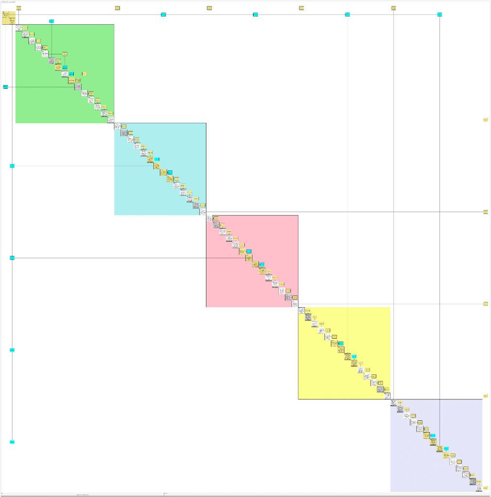 I realize that the diagram may not be readable in this format but here is the simple analysis. The diagram shows that there are 27 functions identified down the diagonal and 68 exchanges between the functions. This includes the inputs and outputs of the system. When describing behavior, I use functions to define the specific actions that an element/part of the system is doing. The true behavior is really in the observables (outputs) and the functions are what do the transformations to create the behavior.