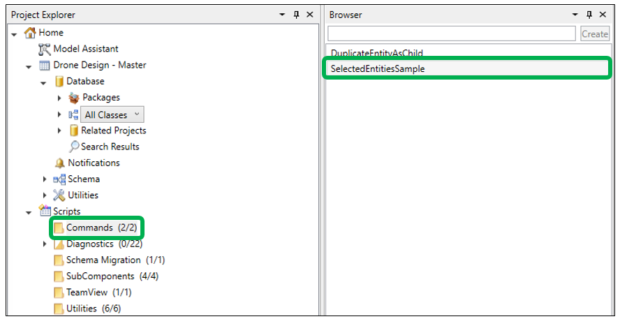 So now we know the first step is to get the selected entity with our script so that we have a starting point for our script. So how do we do that? Luckily, GENESYS provides some really good sample scripts and one of these in particular would serve as a great starting point for our new script. Let’s take a look in the Scripts folder (near the bottom of the Project Explorer Tree) and find look in the Commands folder. In the Commands folder we see two scripts that were provided with GENESYS, the DuplicateEntityAsChild script and the SelectedEntitiesSample script. Hm, the SelectedEntitiesSample seems like it might be a good starting point to me! We need to select an entity, don’t we?