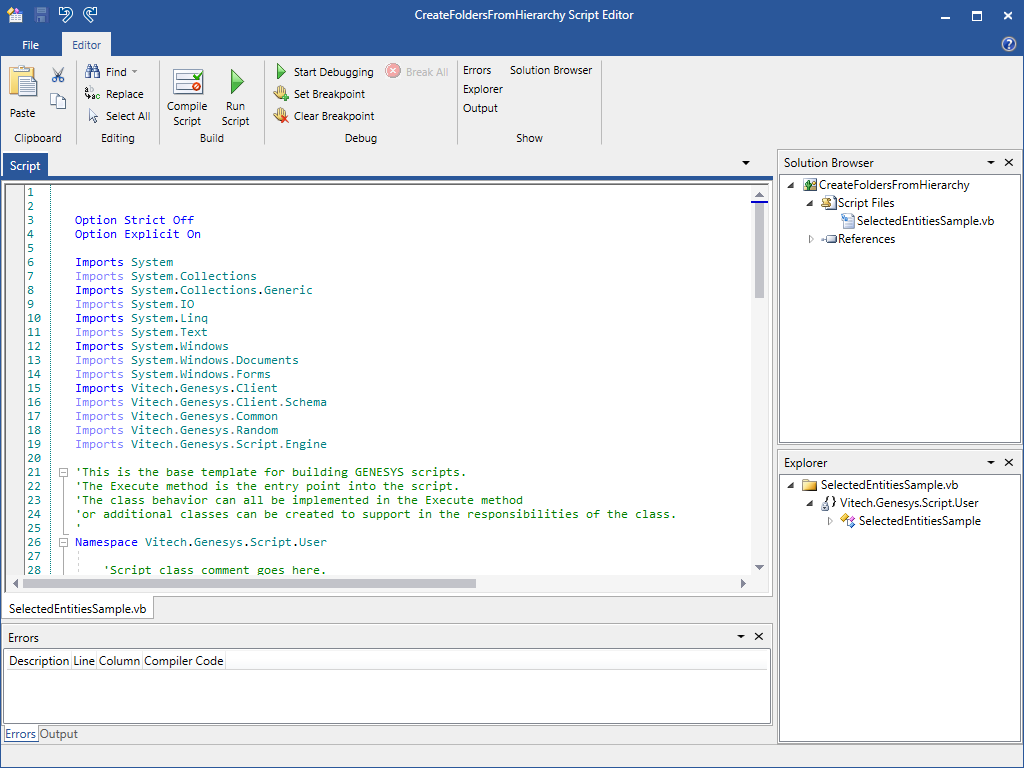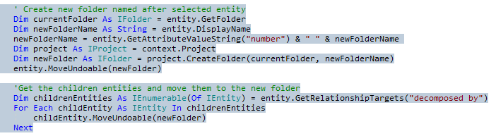 Here we see the code that allows us to work with the selected Entities in the Project Explorer. For this post I’m not going to go in detail on every line of code, instead I’m going to explain how to insert the code we need to perform the folder operations we want. Don’t worry though, I will return to the code in my next post and we’ll get down into the individual code statements then. For now, I want to show the basic setup and get this helpful script running for you!