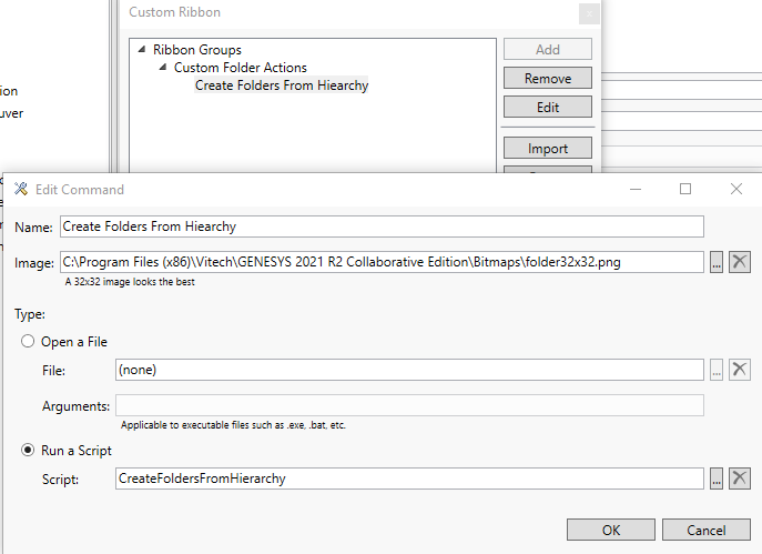 When you select the button, you’ll get the simple Custom Ribbon dialog box. In this dialog box simply select “Add” and then give a name to the new ribbon group you want to create, perhaps “Customer Folder Actions” to hold our folder acting script. After the creation of the group, select the newly created group and then select the “Add” button again. This will bring up the dialog that will allow us to assign a script to the new button. In this dialog you’ll create the name for your new button (pro tip: keep the name as short as possible!), select an image file for the icon (pro tip: the web’s full of useful icons, just resize them to 32×32 pixels) and finally select the script that we just modified to create the folders that will execute when the button is pushed.