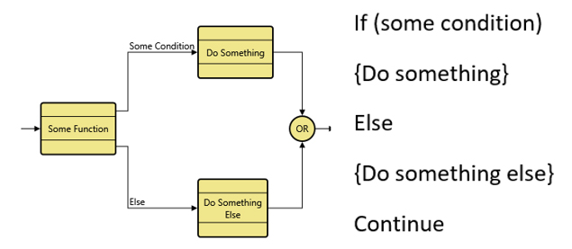 Last time, I stated that only a single Exit Condition from a Function can be chosen. Why is that? Why can’t multiple paths be taken upon exiting a function? If we consider exit paths to be like the output of an if-else statement in a program, I think it will become clearer how exit decisions are working. Consider the similarities between a simple function with two exits and the simple if-else programming statement: