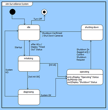 State transition diagrams describe the logical transition of a system through various states of operation. Presented in a freeform layout, the state transition diagram represents states, the transitions that connect them, and the events that trigger transitions. The implementation of the diagram in CORE aligns with the SysML representation.