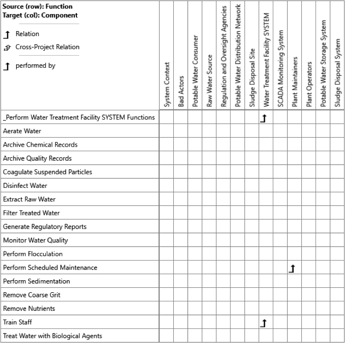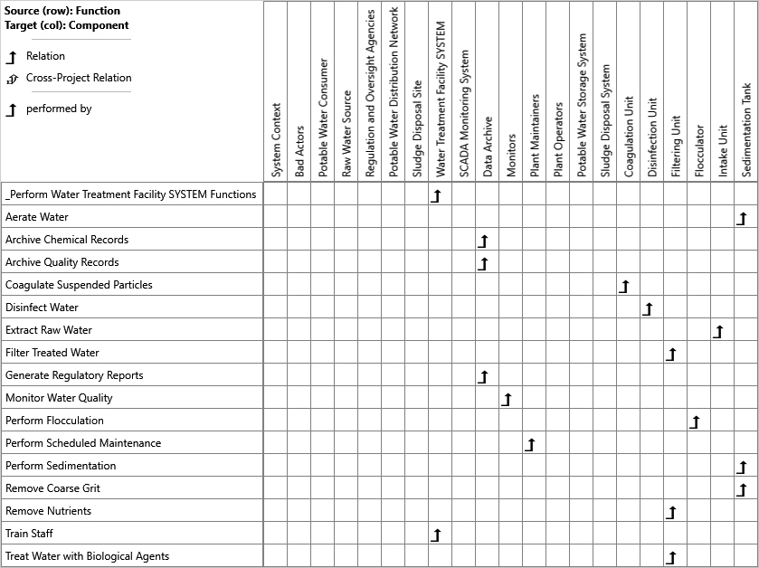 We’re now deep into the behavioral architecture: the “what the system does” for the Water Treatment Facility, derived from what we know. At this stage, we can use our tool to perform a gap analysis to identify missing elements needed to complete a functional and physical view of the architecture. A matrix can be constructed to perform a pairwise analysis to determine what modeled functions do not have a modeled component to perform it. This analysis can be extended with additional matrices to confirm that every requirement is represented somewhere in the architecture and that each has an associated verification plan. Notably, a spider diagram can be used to show all of the same information in one picture, though this view would almost always be too dense to present in a blog format. We’ll narrow our focus to the functional gap analysis in the matrix shown below. Any missing relation arrows reveal that we need another element in our physical architecture to perform the associated function.