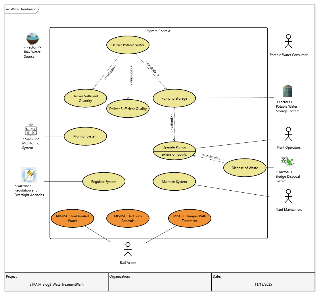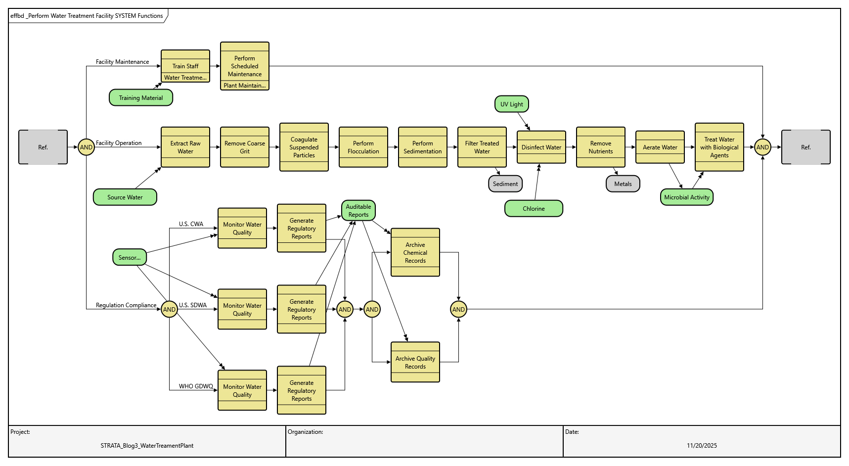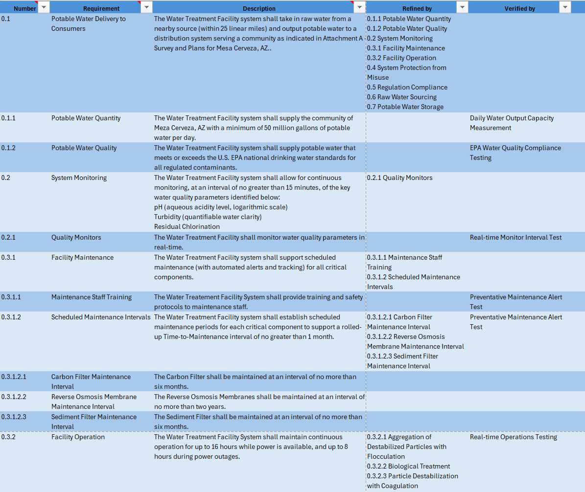 We now have requirements defined at both the system and subsystem levels for our Water Treatment Facility, along with high-level verification planning with everything tied back to the needs established through use cases. Some of these requirements are functional in nature, making functional analysis essential to capture known behaviors and ensure they integrate into a complete, coherent architecture. This process also strengthens traceability by ensuring every function and requirement is linked to its origin, supporting validation and compliance throughout the design lifecycle. Below are examples of functions we can analyze and decompose.
