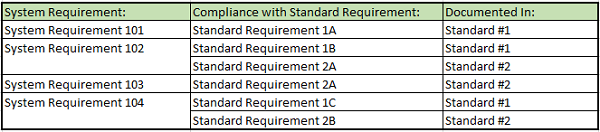 Once this schema extension is in place and the model populated, several traceability tables can be developed to trace from the standard, through the standard requirement, to the system requirements. Alternatively, traceability can be demonstrated from the system requirements to the standards being satisfied.