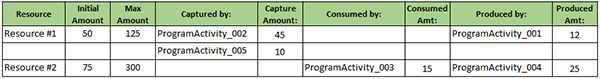 In order to answer our question and manage the resource information, we can pull the resource relationship attributes into the Excel spreadsheet for quick review and manipulation. The example below is an Excel spreadsheet showing the resource and its amount; the captured by, consumed by, and produced by relationships; and the corresponding relationship attribute Amount. When doing this, be sure to specify the type as relationship (not targets) when querying the resource so that you can also pull in the associated attribute value for the relationship.