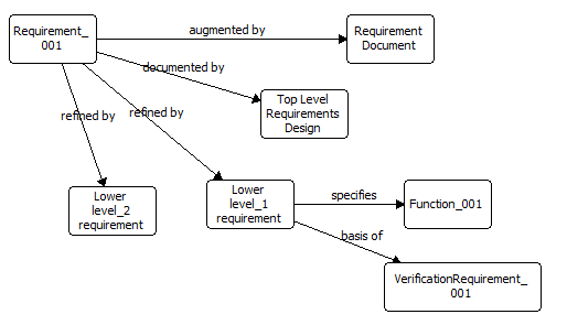 Elements (i.e., entities) correspond to nouns in English. Elements define objects and serve as the basic units in the system repository. The tools (CORE and GENESYS) group these elements into one of several classes (e.g., Requirement, Function, etc.) in the system repository. As an example, requirements may be sub-classified as either an originating requirement extracted from source documentation for a system, a refinement of a higher-level requirement, a derived characteristic of the system, one of its sub-components, or a design decision.
