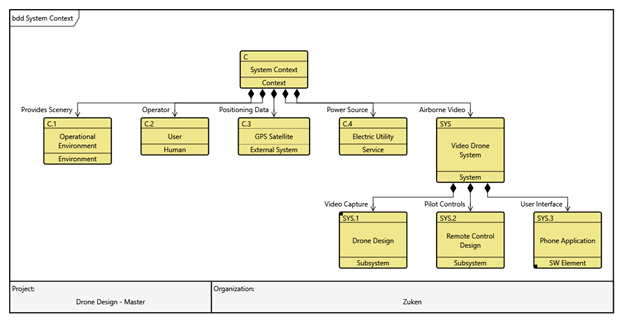 When you’re building your models a good rule of thumb is to make sure that the entity at the top of a folder is the entity you would like the engineer to open a diagram on first. For example, when you look in the organized function folder you’ll find the “CF Context Functions” folder first. When you select that folder, the entity at the top of the list should be the starting point for opening a diagram. In that folder the first function is “CF _Perform System Context Function”, which is the top level of the function model, if you open an EFFBD or an Activity Diagram on that entity you’ll be at the beginning of the functional model. If you select the “SYSF Drone System Functions” folder, you’ll find a single entity, the “_Perform Video Drone System Functions”, which you can open and see the Drone system functions. Use numbering to get it there if you need to, but make it easier on your model users to navigate by always following that simple rule. If the model user can always expect to find the entity you want them to open at the top of the folder, it makes the model easier to navigate.