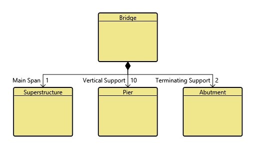 The systems engineer uses GENESYS to capture the major elements and their relationships in the bridge design: superstructure, piers, and abutments.