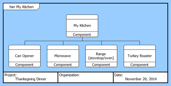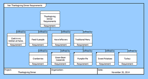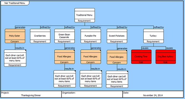 In this sample, the diagram immediately above is probably all that I need. I can just save the view as an image and move on. But what if my dinner was for 40 people? I’d have more requirements, more concerns, more risks…more of everything, and I doubt I could make sense of an image that large so I would start looking at techniques used for complex systems like layers of related images.