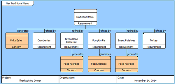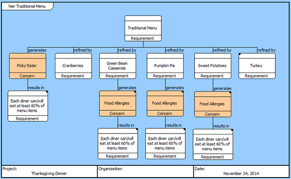 I’ve captured the allergy concern and connected it to the requirements for the menu items that will need special consideration. I could have connected it directly to the Traditional Menu requirement, but I chose to go down a layer because I want to call special attention only to the menu items that will need adjustment.