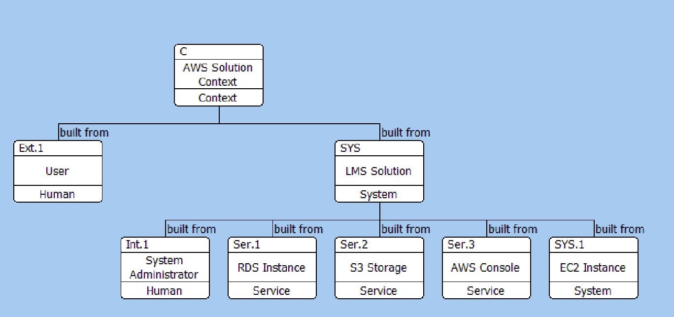 The Component hierarchy below shows the structure of the solution and its relationship to the context and an external actor, in this case a User. I have included the System Administrator within the solution as the practices and procedures for the system administrator are going to be an output from the solution design.