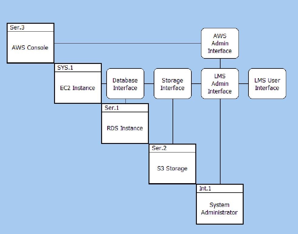 The first step is to identify the interfaces between the elements in the solution and also the external actors interacting with our solution. In the Interface N2 diagram below we can see the interfaces when we look inside the LMS Solution.