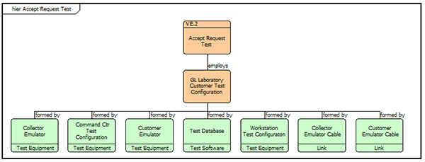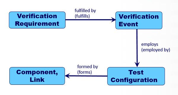In the schema we relate VerificationRequirements to VerificationEvents. Then, in turn, we relate a TestConfiguration to a VerificationEvent and can trace from a TestConfiguration to the Components and Links that form the particular TestConfiguration.