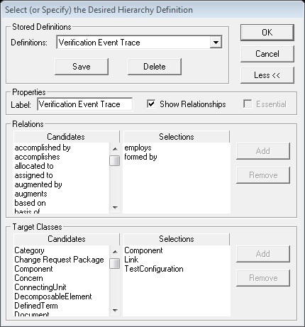 Using the relationships in the schema we can now examine the support requirements needed for any verification activity. Custom hierarchies are quick graphical queries that allow us to view a subset of the model working from a starting point (in this case a verification event) and through the relationships and target classes of interest. In the case of test configuration management, we can trace from the verification event of interest to the test configuration and then to the specific equipment (uniquely configured test equipment and cables) needed to support the verification event and complete the testing. The hierarchy can be created using the custom hierarchy selections shown below.