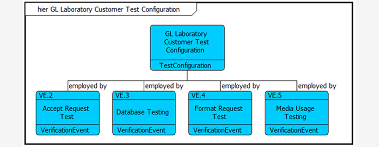 This custom hierarchy shows full traceability from the specific verification event to the necessary test configuration and then to the components and links needed to support the testing.